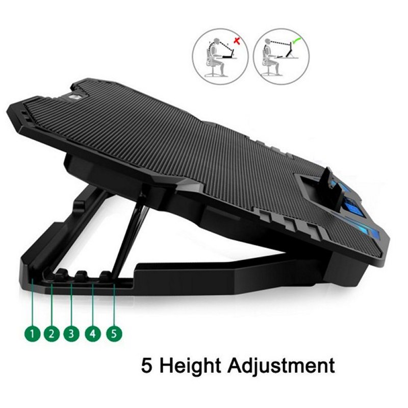 | Características | – Notebooks de 12" – 17" – Tipo de ventilador: 5 ventiladores silenciosos – Dimensión del ventilador: 125 x 125 x 10mm y 70 x 70 x 10mm – Color del ventilador: Azul – Velocidad del ventilador: 1000RPM a 2500RPM – Ruido: 25dBA – Flujo de aire: 80 CFM – Fuentes de alimentación: vía USB (5V DC) – Longitud del cable de alimentación USB: 50cm – Peso: 1.150gr – Dimensiones: 370 x 300 x 38mm – Color: Negro – Material: ABS y aleación de aluminio |