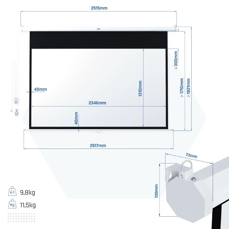 | Otras Características | – Factor de ganancia: 1.0. – Auto-Stop: ajustable a cualquier altura – Material cajetín: acero – Puede colocarse en techo o pared – Trasera negra opaca – Bordes negros de 3 cm a la izquierda y derecha – Fácil montaje – Alta calidad y durabilidad – Ideal para cine en casa y salas de conferencias – Ideal para cualquier tipo de proyector, SVGA, XGA, 3D, HD, Full HD y 4K | |