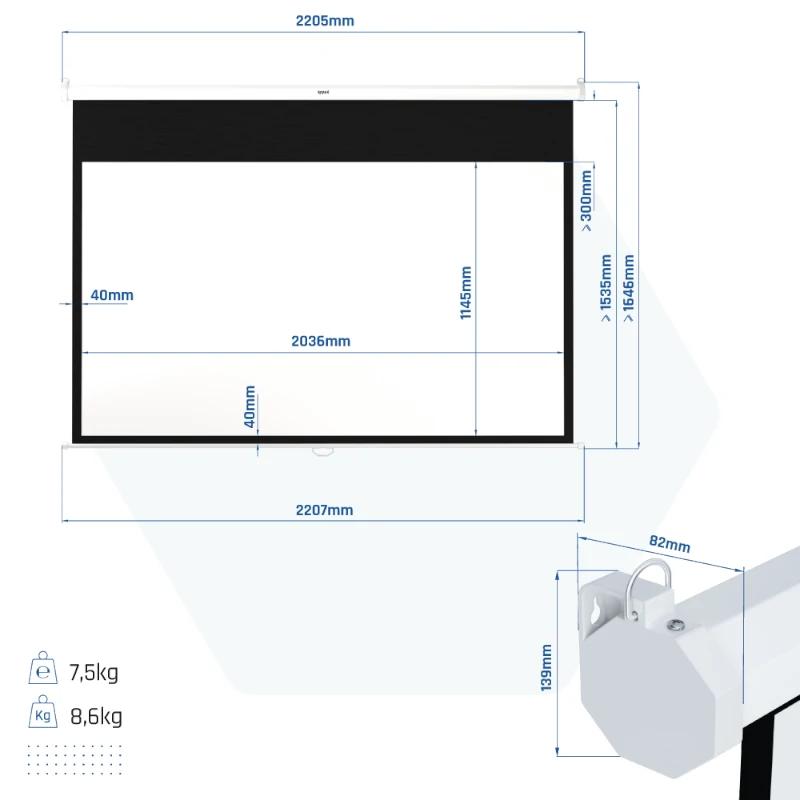 | Otras Características | – Factor de ganancia: 1.0. – Auto-Stop: ajustable a cualquier altura – Material cajetín: acero – Puede colocarse en techo o pared – Trasera negra opaca – Bordes negros de 3 cm a la izquierda y derecha – Fácil montaje – Alta calidad y durabilidad – Ideal para cine en casa y salas de conferencias – Ideal para cualquier tipo de proyector, SVGA, XGA, 3D, HD, Full HD y 4K | |